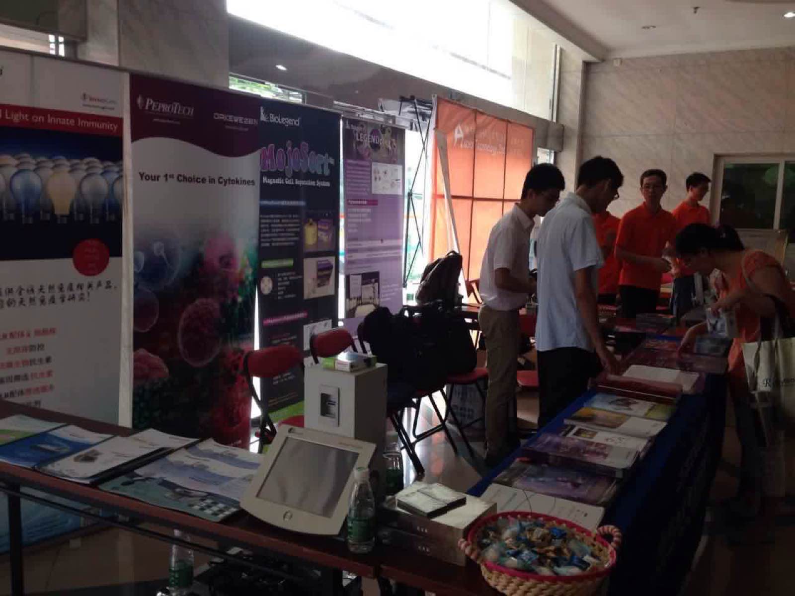 我司在A1號展臺,準(zhǔn)備了5副免疫殺撲克牌供展覽用,同時(shí)帶來公司的產(chǎn)品目錄冊以及免疫組(小彩圖:mechanisms of cell death,DC、巨噬細(xì)胞,中彩圖:Breg,Treg,th17)等資料以及細(xì)胞組的轉(zhuǎn)染、細(xì)胞治療組的PPT和儀器彩頁等資料供參會人員瀏覽,展臺的兩邊我們放置了多因子、磁珠分選等3個(gè)易拉寶供參會人員觀看,技術(shù)部同事現(xiàn)場進(jìn)行技術(shù)儀機(jī)器演示。
