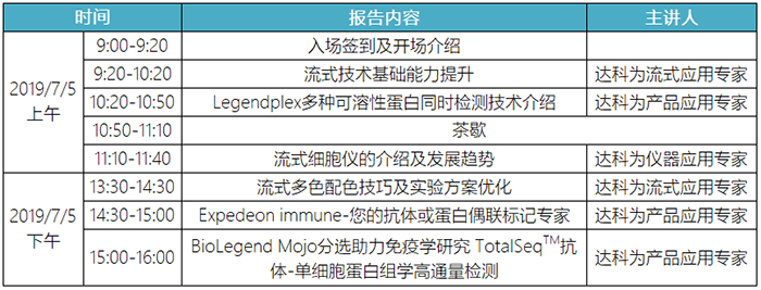 達科為生物公司作為國內一流的生物試劑供應商,多年來在全國各地免費舉辦了百余場流式培訓班,取得了熱烈的反響和良好的反饋。此次流式培訓班將于2019年7月5日-7月7日舉辦。