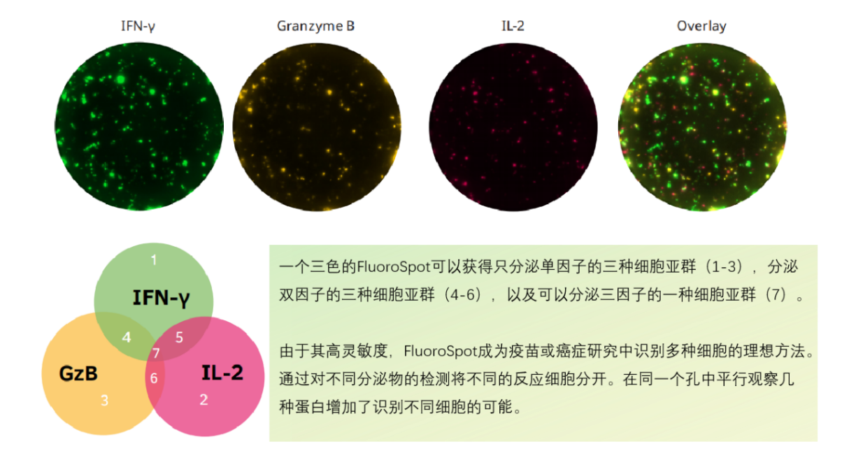相比于ELISpot,FluoroSpot依舊維持了ELISpot的高靈敏度,還能對單細胞分泌的多種細胞因子同時進行檢測,從而實現細胞亞群的鑒定和細胞多功能性分析。