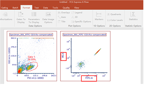 圈中目的細胞群,拖至空白處形成一個新的圖形,并根據需要改動橫縱坐標軸的參數。本示例中以FITC和PE為例,調節此兩通道之間的補償。下圖所示,補償未經過調節,FITC與PE之間有補償。