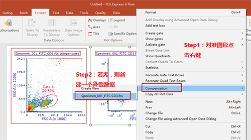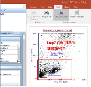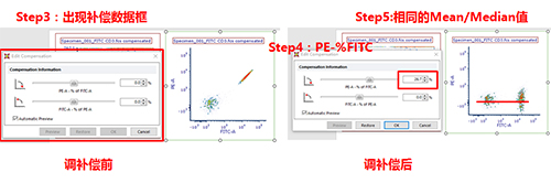 此時可以手動調節兩通道之間的補償,該數據為FITC單管,可用PE-FITC調節FITC滲漏到PE通道去的熒光。步驟如下圖所示: