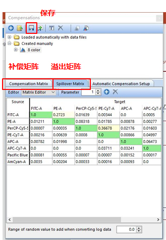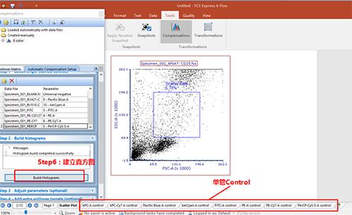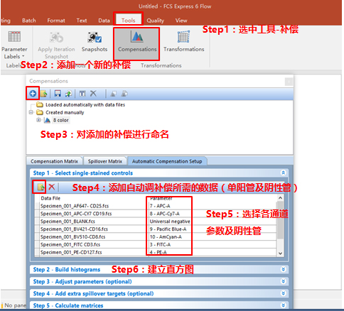 依次調整好各單管Control的Marker門的位置。此處不一一列舉。回到補償界面。此處的3、4適用于使用補償beads調節補償的情況(由于本次數據為細胞,此處不詳細列出,如對此步驟感興趣,可咨詢小達君)
