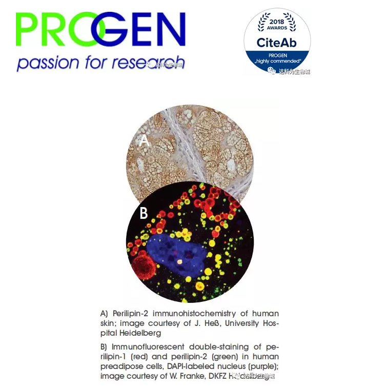 脂代謝與各種疾病的關系還需要需要更多的研究數據,可靠的抗體是可靠結果的有力保證。Progen,德國品質,始于1983,是目前可提供較全PLIN1-5抗體以及發表文章較多的生產商,榮獲2018年CiteAb頒發的highly commended awards 。