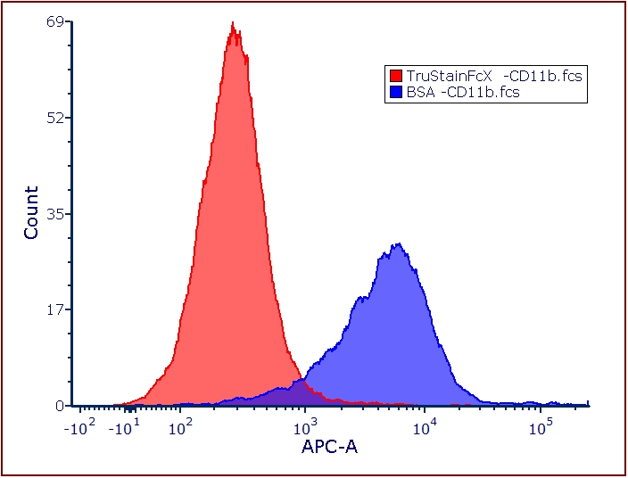 (OCI-AML3細胞系用TruStainFcX(Cat#101319)封閉(紅色TruStainFcX直方圖)以及用5%BSA封閉(藍色BSA直方圖)后,染APC-CD11b(cat#101211,cloneM1/70)結果)