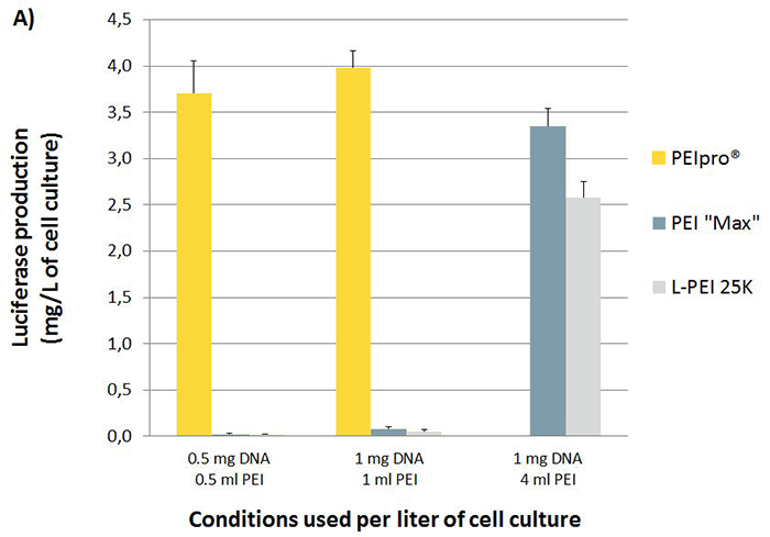 懸浮HEK-293以1×106cells/mL的密度接種在無血清培養基中,使用重懸后濃度為1 mg/mL的PEIpro?、PEI “Max” 和L-PEI 25 kDa (Polysciences, Warrington, PA)進行轉染。采用常規熒光素酶測定法在轉染后48h測定熒光素酶的表達