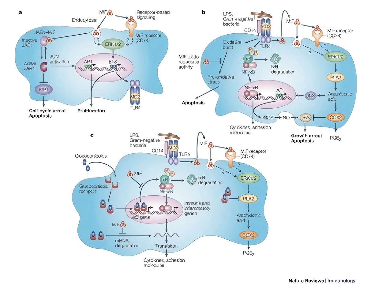 當用 LPS 刺激時,巨噬細胞釋放 MIF。免疫細胞的其他促炎效應分子,如 TNF 和 IFN-γ,也是巨噬細胞產生 MIF 的強誘導劑。MIF 在組織或體循環中釋放后,作為一種經典的促炎細胞因子,通過激活巨噬細胞和 T 細胞來促進先天性和適應性免疫反應。