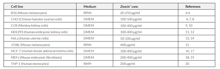 Zeocin?通常以100 μg/ml的濃度使用,即將原液(100 mg/ml in HEPES buffer)稀釋1000倍使用。但也需要根據(jù)您的具體細(xì)胞來確定最佳濃度。下表列出了在一些哺乳動(dòng)物細(xì)胞篩選實(shí)例中的Zeocin?建議濃度。