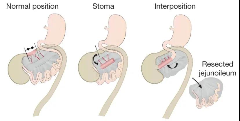 分兩步進行的手術方法,用于在空腸的起點和回腸的終點之間插入需要移植的結腸類器官。
