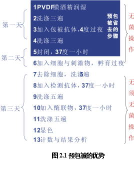 如圖2.1所示,預(yù)包被有著明顯的技術(shù)優(yōu)勢。PVDF板的ELISPOT試驗(yàn)一共需要3天時(shí)間,采用預(yù)包被板可以節(jié)省一天的時(shí)間,當(dāng)天處理細(xì)胞,當(dāng)天上板檢測;未包被的檢測共有13步,預(yù)包被可以省掉其中的5步,并且這5部都是需要無菌操作的步驟,占整個(gè)無菌操作步驟的5/6。節(jié)省時(shí)間只是其一,由于減少了無菌操作的步驟,使得整個(gè)實(shí)驗(yàn)污染與出錯(cuò)的概率大大降低,提高了整體試驗(yàn)的成功率。