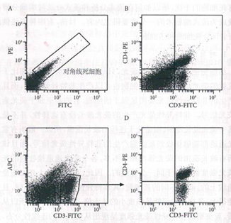雖然死細(xì)胞位于散點(diǎn)圖的對(duì)角線上,但是對(duì)角線上的細(xì)胞確不一定是死細(xì)胞,因?yàn)殡p陽(yáng)性細(xì)胞如果在x軸和y軸的熒光信號(hào)相似時(shí),也可以位于對(duì)角線上。所以,散點(diǎn)圖對(duì)角線上的細(xì)胞可能是死細(xì)胞,也可能是雙陽(yáng)性細(xì)胞。如圖1-B所示,樣本細(xì)胞為正常小鼠脾臟細(xì)胞,標(biāo)記 FITC-抗CD3抗體和PE-抗CD4抗體,F(xiàn)ITC和PE雙陽(yáng)性的CD4 T細(xì)胞和死細(xì)胞混在一起,無(wú)法區(qū)分。但是死細(xì)胞和雙陽(yáng)性細(xì)胞的形狀是不一樣的,死細(xì)胞呈現(xiàn)連續(xù)的線型分布,而雙陽(yáng)性細(xì)胞群呈現(xiàn)圓形的群體分布,因此,可以從對(duì)角線上的細(xì)胞群體的形狀大致判斷細(xì)胞的性質(zhì)。雖然不能根據(jù)熒光強(qiáng)度的強(qiáng)弱來(lái)區(qū)分該熒光信號(hào)是來(lái)自于死細(xì)胞的非特異性熒光還是來(lái)自熒光素產(chǎn)生的熒光,但是可以利用在散點(diǎn)圖上死細(xì)胞位于對(duì)角線的特點(diǎn)來(lái)區(qū)分死細(xì)胞和陽(yáng)性活細(xì)胞。如圖1-C所示,x軸表示FITC通道(樣本細(xì)胞標(biāo)記有FITC-抗CD3抗體),y軸表示APC通道(閑置通道),借用該散點(diǎn)圖可以明確區(qū)分圖1-B中無(wú)法區(qū)分的死細(xì)胞和雙陽(yáng)性細(xì)胞。此時(shí)只需要將排除了死細(xì)胞后的CD3 T細(xì)胞設(shè)門(mén),將門(mén)內(nèi)的細(xì)胞顯示于新的FITC-PE散點(diǎn)圖中,如圖1-D,此時(shí)該散點(diǎn)圖內(nèi)的細(xì)胞都是活細(xì)胞,因?yàn)闃颖炯?xì)胞同時(shí)標(biāo)記有PE-抗CD4抗體,所以圖中的細(xì)胞明顯分為兩群,雙陽(yáng)性的是CD4T細(xì)胞,單陽(yáng)性的是CD8 T細(xì)胞。