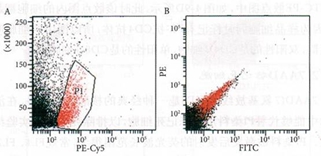 PE-Cy5通道(通常是FL3,接收的熒光波長(zhǎng)范圍大致為655-685nm)有時(shí)可用于識(shí)別死細(xì)胞,但首先該通道必須是閑置的通道,及樣本細(xì)胞中沒(méi)有標(biāo)記該通道代表的熒光素(PE-Cy5、PerCP等)偶聯(lián)抗體。選擇PE-Cy5-SSC散點(diǎn)圖,一般可看到不成群的PE-Cy5陽(yáng)性細(xì)胞,這些陽(yáng)性細(xì)胞的SSC值也是散在分布的,這些散在的PE-Cy5通道非標(biāo)記陽(yáng)性細(xì)胞,即圖2-A中的紅色部分,將這部分細(xì)胞設(shè)門(mén)顯示于FITC-PE散點(diǎn)圖中,如圖2-B所示,這部分PE-Cy5通道非標(biāo)記陽(yáng)性細(xì)胞基本都位于對(duì)角線部分,而對(duì)角線細(xì)胞一般為死細(xì)胞,所以散在的PE-Cy5通道非標(biāo)記陽(yáng)性細(xì)胞一般就是死細(xì)胞。