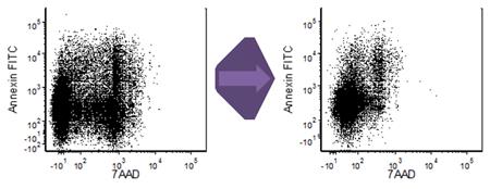 圖為:體外培養(yǎng)一天的C57BL/6小鼠脾細(xì)胞做Annexin V/7-AAD染色的流式數(shù)據(jù)。其中,左邊為未經(jīng)固定處理的細(xì)胞上機(jī)檢測(cè)結(jié)果; 右邊為經(jīng)過(guò)70%EtOH, 1.5%PFA固定處理的細(xì)胞上機(jī)檢測(cè)結(jié)果。