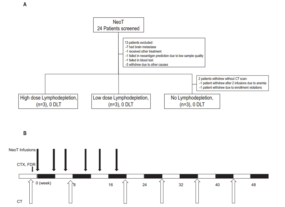 針對這些問題,中山大學徐瑞華團隊在2023年6月10日發表了題為“A pilot study of lymphodepletion intensity for peripheral blood mononuclear cell-derived neoantigen-specific CD8+ T cell therapy in patients with advanced solid tumors”的研究論文。該研究開發了一種從癌癥患者的外周血單個核細胞(PBMCs)中產生個性化Neo-T(新抗原特異性CD8+ T細胞)的方法。作者建立了一個流程,包括通過生物信息學分析預測新抗原,并在25天內大規模擴增新抗原特異性T細胞。為了評估Neo-T治療的臨床療效并確定Neo-T治療的最佳淋巴細胞耗竭強度,作者進行了一項首次在人體中使用氟達拉濱和環磷酰胺增加劑量的Neo-T治療的研究。該研究是一項開放標簽I期臨床試驗(NCT02959905),包括標準治療難治的局部晚期或轉移性實體瘤患者。