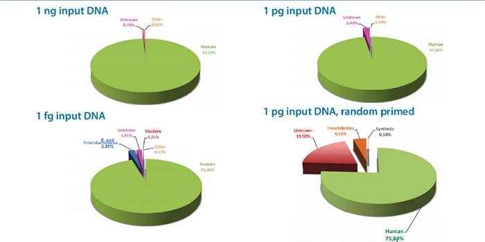 結(jié)果表明僅使用1fg 的樣本即可以擴增出95%以上的人體基因組片段;而使用隨機引物擴增的結(jié)果中,約有20%不匹配任何生物體的非特異性序列(右下圖)。