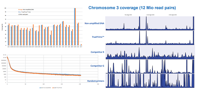 右圖:3號染色體圖譜的覆蓋模型,TruePrime?擴增得到的DNA與未擴增的DNA覆蓋率接近。