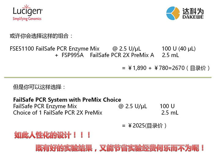 FailSafe? PCR PreMix Selection Kit專為滿足每個PCR需求而設計,包含一種獨特的熱穩定DNA聚合酶和12種PCR 緩沖液 PreMix,全面地涵蓋了各種反應條件,使不同序列均能得到較好的PCR結果,取代了以前反復調整PCR反應成分,以確定最佳反應條件的繁瑣過程。