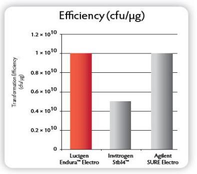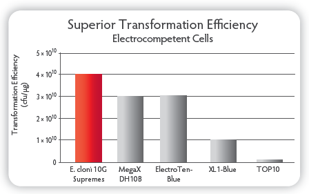 E. cloni? 10G ELITE電轉感受態轉化效率≧2×1010 cfu/μg,E. cloni? 10G化學轉感受態轉化效率≧1×109 cfu/μg;