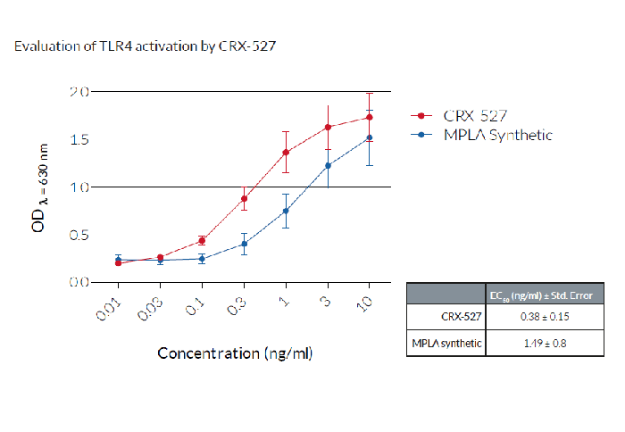 將細(xì)胞分別與遞增濃度的CRX-527、合成的單磷酰脂質(zhì)A(MPLA)孵育。在HEK-BlueTM檢測培養(yǎng)基(SEAP檢測生長培養(yǎng)基)中孵育過夜后,通過測定上清液中是否存在SEAP來評估TLR4的活化。數(shù)據(jù)表示為OD(λ=630nm)(±SEM)