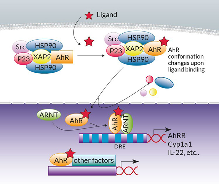 典型AhR訊號已經(jīng)被廣泛綜述過1。簡而言之,在沒有配體的情況下,AhR位于細(xì)胞質(zhì)中Hsp90:XAP2:p23:Src伴侶蛋白復(fù)合物內(nèi),當(dāng)配體結(jié)合時(shí),復(fù)合物發(fā)生構(gòu)象變化并轉(zhuǎn)移到細(xì)胞核中。伴侶蛋白被釋放,AhR和AhR核轉(zhuǎn)位子(ARNT)異源二聚。在細(xì)胞核中,AhR:配體:ARNT三聚體與AhR靶基因上游調(diào)節(jié)區(qū)域的二噁英應(yīng)答元件(DRE)結(jié)合,以控制包括細(xì)胞色素P450依賴性單加氧酶Cyp1a1、AhR 抑制因子(AhRR)和IL-22白細(xì)胞介素的轉(zhuǎn)錄。值得注意的是,無輪是在基因組水平上通過與其他轉(zhuǎn)錄因子(例如NF-κB)相關(guān)聯(lián),還是在非基因組水平上(例如通過釋放Src激酶),非典型AhR信號通路也有被報(bào)道過2,3。