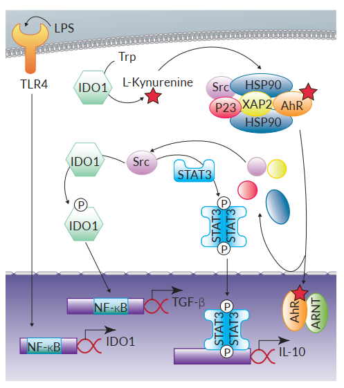AhR參與調(diào)節(jié)促炎反應(yīng)和耐受反應(yīng)的機(jī)制可以從多方面解釋,除了前文提過可以導(dǎo)致IL-22產(chǎn)生的典型AhR信號,AhR也通過非基因組途徑導(dǎo)致至少兩個(gè)抑制性效果。研究發(fā)現(xiàn)與AhR相關(guān)的Src激酶能夠磷酸化吲哚胺2,3-雙加氧酶(IDO1),進(jìn)而激活NF-κB轉(zhuǎn)錄因子誘導(dǎo)DCs中抑制性細(xì)胞因子TGF-β(transforminggrowth factor)的轉(zhuǎn)錄,達(dá)到抑制小鼠對LPS的過度應(yīng)答9。此外, IDO1對Trp的降解提供了例如L-型犬尿氨酸(L-Kynurenine)的AhR激動(dòng)劑,提示了這通路與Treg的產(chǎn)生有關(guān)9。在巨噬細(xì)胞中,AhR另一個(gè)抑制作用是在LPS誘導(dǎo)下,AhR協(xié)同Src激酶和STAT3信號通路產(chǎn)生抗炎細(xì)胞因子IL-10。值得留意的是,TLR4對LPS的識別可促進(jìn)巨噬細(xì)胞中AhR的表達(dá),但目前尚不清楚在其他模式識別受體配體刺激的情況下是否也是如此10。