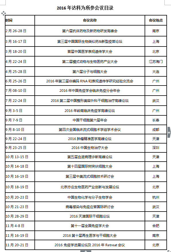 2016年達科為生物技術有限公司參展會議列表